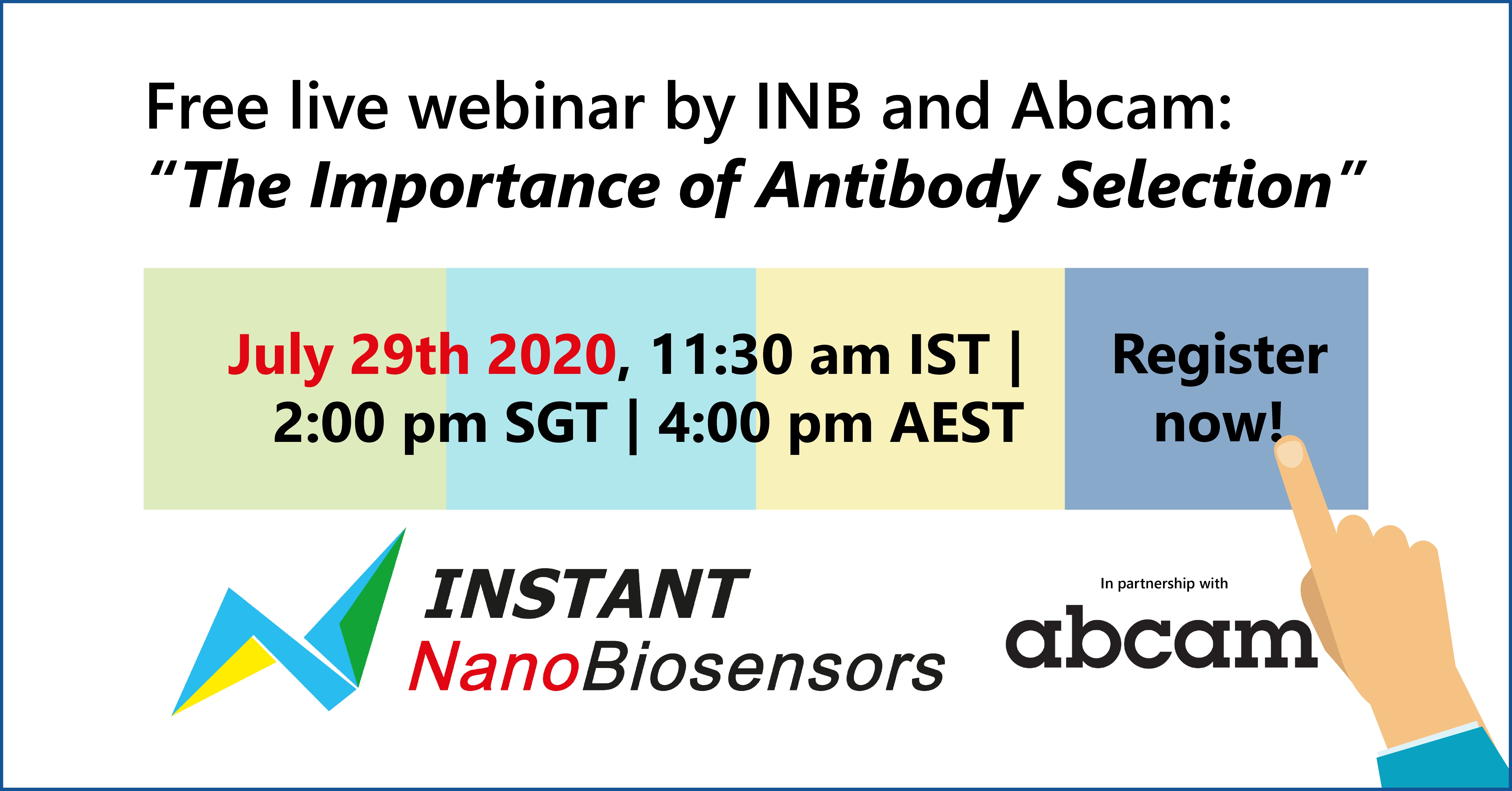 Register today to hear the experts Tony Chung (CEO, Instant NanoBiosensors) and Ryan Chong (Commercial Director, Abcam Taiwan) discuss the importance of Antibody Selection. This free webinar will broadcast live on July 29, 2020, 11:30 am IST | 2:00 pm SGT | 4:00 pm AEST.